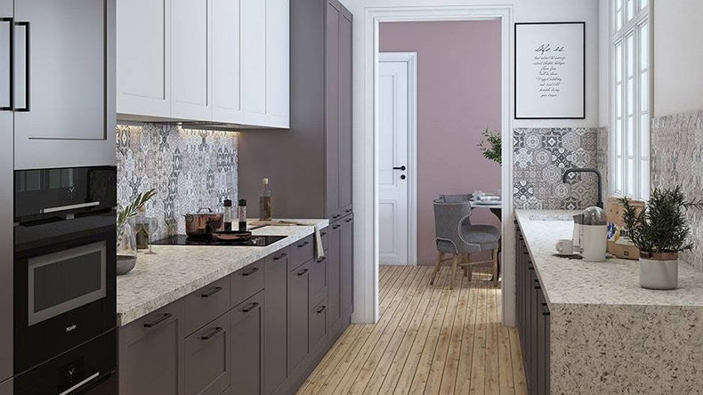 This white bar-style parallel kitchen design artistically incorporates natural stones like marble or granite. The intertwining of all vintage elements radiates a luxurious atmosphere. The unique allure of marble not only enhances the kitchen's beauty but also adds a touch of elegance, making the space more visually pleasing. This kitchen design adds a touch of opulence and comfort to everyday cooking.