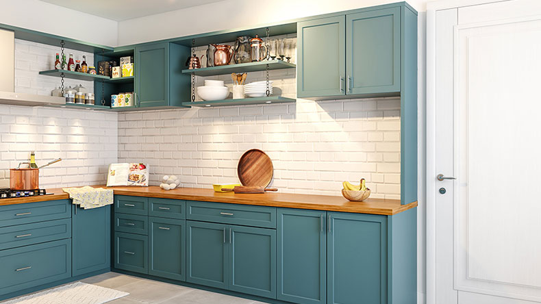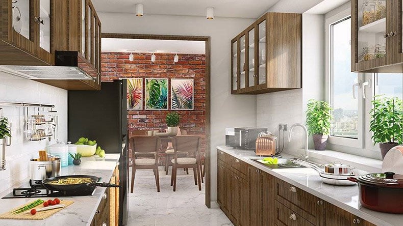 This rustic, warm kitchen features a brick wall design, exuding beautiful country charm. The sustainable design and decor reflect Indian aesthetics, making it a popular choice in many homes. Warm wooden cabinets, brick walls, and rough-surfaced shelves add a touch of traditional elegance to this kitchen interior design. It brings back memories of grandparents using copper utensils while maintaining the functionality of a modern modular kitchen.