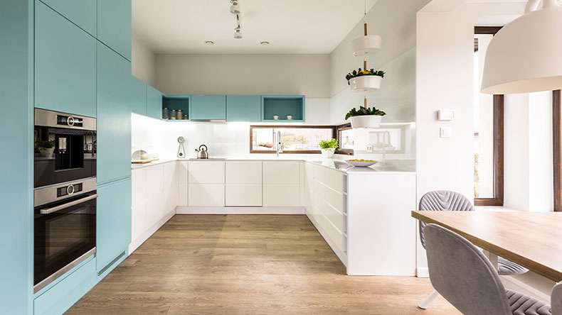 A white kitchen paired with blue cabinets is not only refreshing but also seamlessly blends with various interior styles, such as coastal, modern, Scandinavian, and cozy cottage styles. The neutral white tones contrast beautifully with the vibrant blue, creating a versatile yet eye-catching design that feels both comforting and lively.