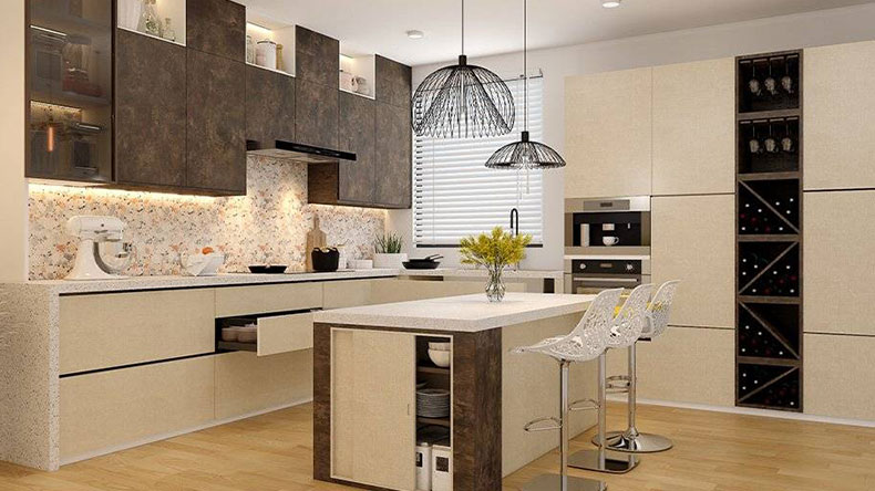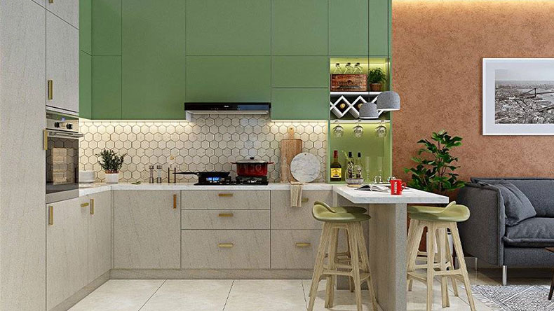 This compact kitchen design, despite its limited space, meets all your daily needs. It cleverly combines overhead and lower cabinets, a breakfast bar, and an open wine rack to maximize functionality. The built-in appliances, stovetop, and chimney add to the kitchen's versatility. The soft color scheme makes it especially suitable for small apartments, making it ideal for those living alone or sharing the space with a partner.