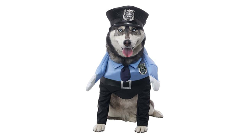 Pets in police costumes, wearing small hats and blue-black uniforms, seem to be maintaining the order of Halloween.