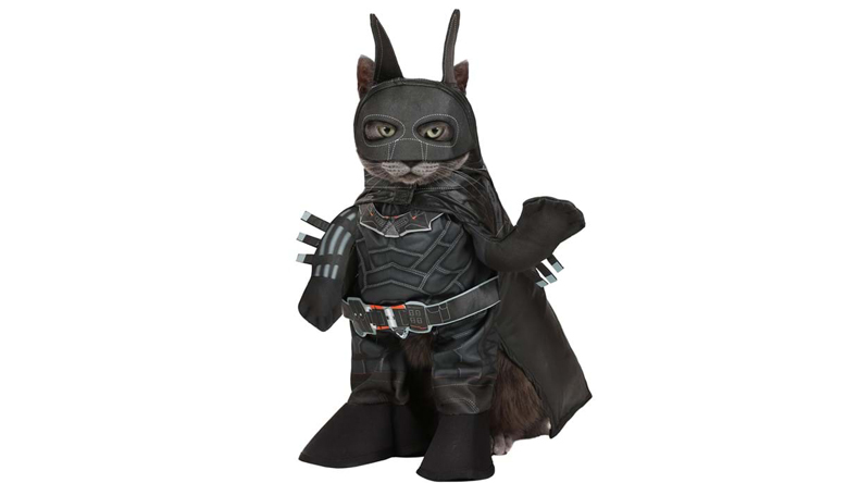The Batman costume is mainly black, with the iconic bat logo, making pets look mysterious and powerful.
