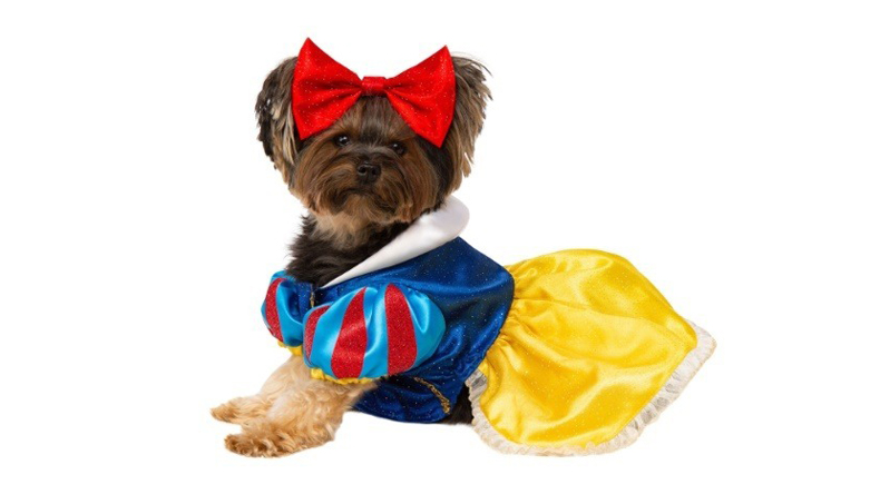 Pets dressed as Snow White wear classic blue and yellow princess dresses and a red bow on their heads. They are very beautiful.