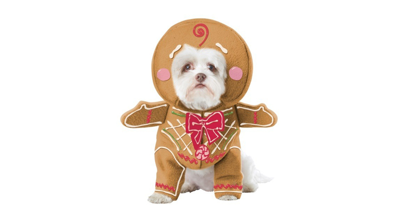 Pets in gingerbread man look wear brown clothes with colorful frosting decorations, making people want to take a bite when they see them.